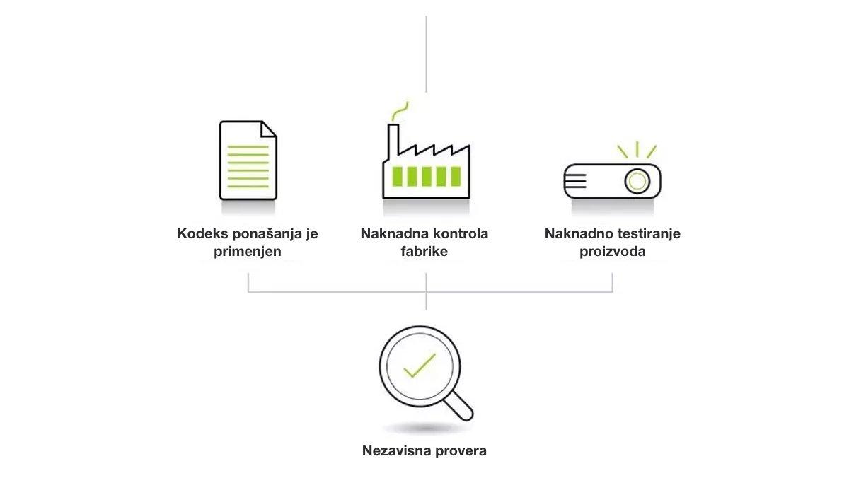 Nezavisna provera usaglašenosti proizvoda, fabrike i vlasnika brenda je uključena, pre i nakon sertifikacije.